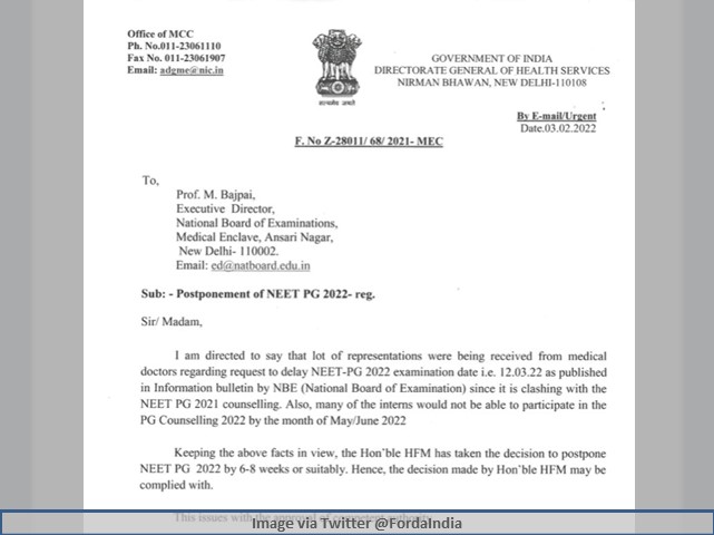 FORDA and several other doctors’ group have been demanding postponement of NEET PG 2022 examination to avoid clash with the on-going NEET PG Counselling 2021. The key concern shared by the Doctors’ group is that many interns who are currently participating in the on-going counselling process will not be able to participate in the exam by the month of May or June 2022. In line with this, the Union Health Minister has accepted these demands and decided to postpone the PG Medical Entrance Exam by 6 to 8 weeks. To confirm the development, NBE has issued an official letter which has been sent to by the Ministry to the exam organizer the NBEMS.