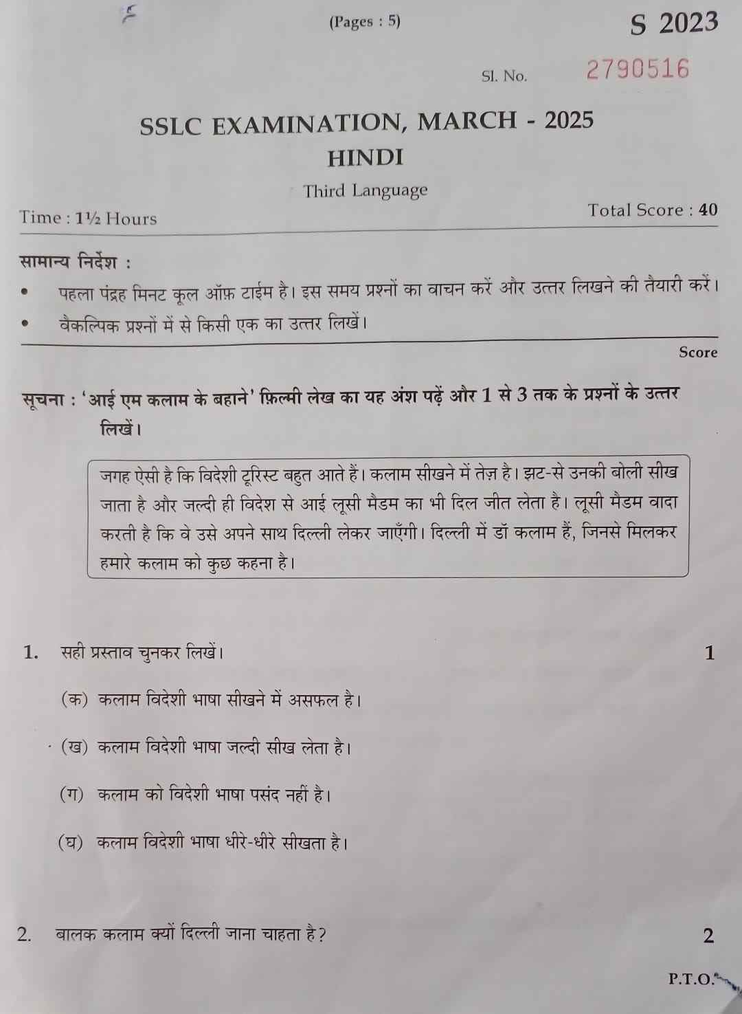 Kerala Board SSLC Class 10th Hindi Question Paper 2025