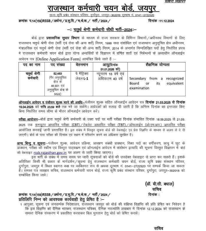 RSMSSB Group 4 Bharti 2024: राजस्थान कर्मचारी चयन आयोग RSMSSB ने राज्य में ग्रुप 4 के 52,453 पदों पर भर्ती के लिए विज्ञप्ति जारी कर दी है. ये भर्तियाँ चतुर्थ श्रेणी कर्मचारियों के पदों पर की जानी है. इस रिक्ति के लिए आवेदन प्रक्रिया 21 मार्च से शुरू हो रही है और आवेदन की अंतिम तिथि 19 अप्रैल 2025 है जबकि परीक्षा का आयोजन 18-21 सितम्बर को किया जाना है. इस भर्ती का लम्बे समय से अभ्यर्थियों को इन्तजार था.