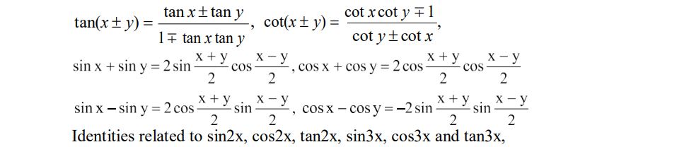 Positive and negative angles, Measuring angles in radians and in degrees and conversion from one measure to another, Definition of trigonometric functions with the help of unit circle. Truth of the identity sin2x + cos2x = 1, for all x. Signs of trigonometric functions and sketch of their graphs, Expressings in (x+y) and cos(x+y) in terms of sinx, siny, cosx and cosy, Deducing the identities