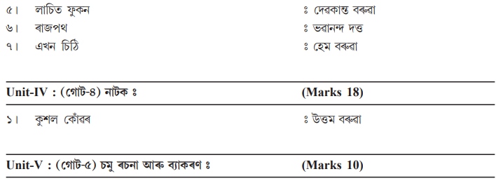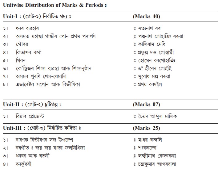The course structure provided here explains the number of units, their topics, marks, and periods required to complete each unit. As per the course structure, the Assamese paper will have 100 marks, whose bifurcation is given below: