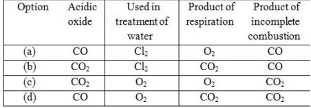| 5 | With the reference to four gases CO2, CO, Cl2 and O2, which one of the options in the table is correct? | 1 |