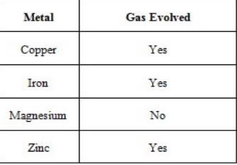 | 6 | On placing a copper coin in a test tube containing green ferrous sulphate solution, it will be observed that the ferrous sulphate solution (a) turns blue, and a grey substance is deposited on the copper coin. (b) turns colourless and a grey substance is deposited on the copper coin. (c) turns colourless and a reddish-brown substance is deposited on the copper coin. (d) remains green with no change in the copper coin. | 1 |