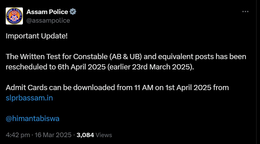 Assam Police Constable 2025: The State Level Police Recruitment Board (SLPRB), Assam has announced the postponement of the Assam Police Constable 2025 exam which was initially scheduled for March 23. The decision was made due to "administrative reasons". The admit card which was expected to be released on March 17 will now be released in April 2025.