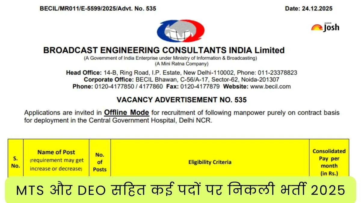 BECIL Delhi Recruitment 2026: ब्रॉडकास्ट इंजीनियरिंग कंसल्टेंट्स इंडिया लिमिटेड (BECIL) की ओर से एमटीएस, डीईओ सहित पदों पर भर्ती निकाली गई है। जिसके तहत कुल 78 रिक्त पदों को भरा जाएगा। इस भर्ती अभियान के माध्यम से दिल्ली एनसीआर के एक केंद्रीय सरकारी अस्पताल में संविदा आधार पर तकनीकी सहायक, नेत्र तकनीशियन, रोगी देखभाल प्रबंधक सहित अन्य पदों की भर्ती के लिए ऑफलाइन आवेदन किए गए हैं।