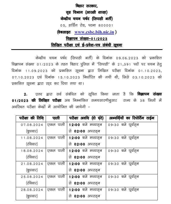 | Bihar Police Constable Exam date (New) | 7th, 11th, 18th, 21st, 25th, and 28th August 2024 |