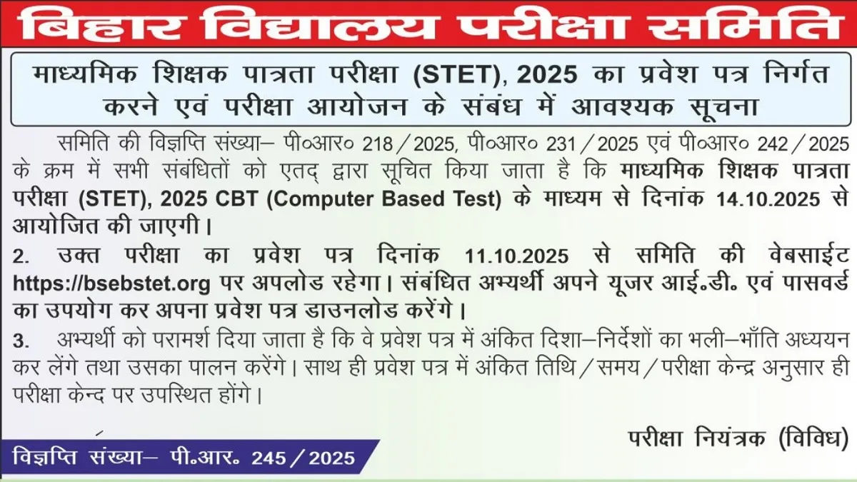 माध्यमिक शिक्षक पात्रता परीक्षा (STET), 2025 का प्रवेश पत्र निर्गत करने एवं परीक्षा आयोजन के संबंध में आवश्यक सूचना।#Bihar#BSEB#BiharBoard#STET pic.twitter.com/ds6BrwZCyI