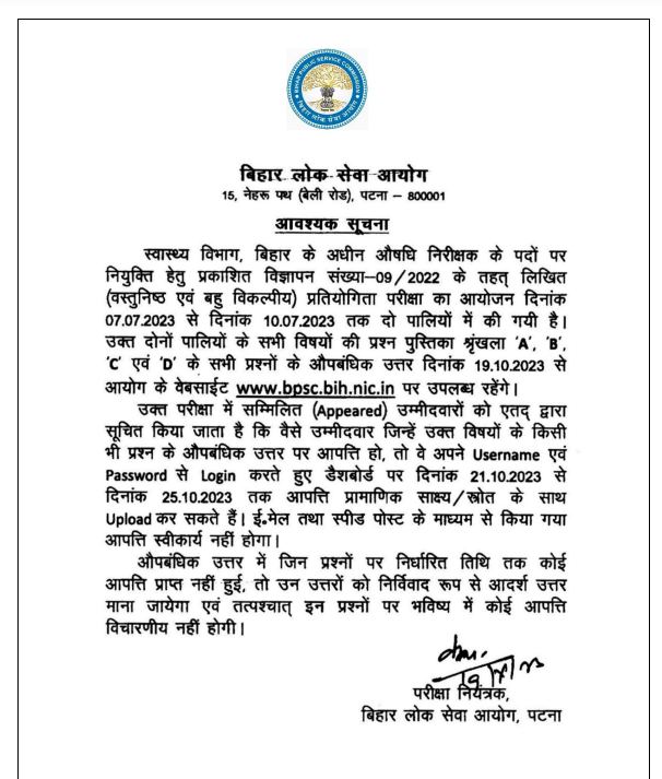 BPSC Drug Inspector Answer Key 2023: आपत्ति तिथि