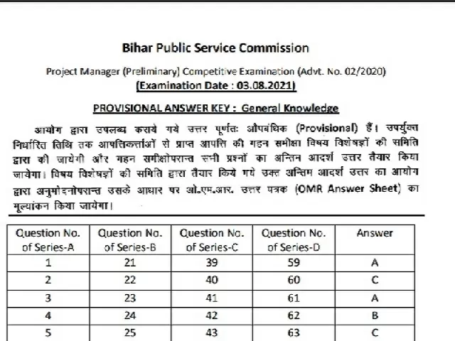 BPSC Project Manager Prelims Answer Key 2021: Bihar Public Service Commission (BPSC) has released the prelims answer key for recruitment to the various posts of Project Manager. The candidates who appeared in the BPSC Project Manager Prelims 2021 Exam against the advertisement number 02/2020 can download the subject wise answer key through the official website of BPSC.i.e.bpsc.bih.nic.in.