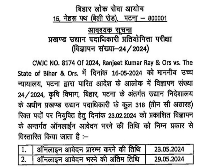 BPSC Block Horticulture Officer Recruitment 2024: बिहार लोक सेवा आयोग (बीपीएससी) ने ब्लॉक हॉर्टिकल्चर ऑफिसर (बीएचओ) भर्ती 2024 के लिए आवेदन विंडो फिर से खोल दी है। यह उन इच्छुक उम्मीदवारों के लिए दूसरा मौका है जो प्रारंभिक आवेदन करने से चूक गए थे। बीपीएससी द्वारा हाल ही में जारी अधिसूचना के अनुसार, ब्लॉक हॉर्टिकल्चर ऑफिसर प्रतियोगी परीक्षा के लिए आवेदन की तारीख 29 मई 2024 तक बढ़ा दी गई है। जो भी उम्मीदवार इस भर्ती के लिए पात्र हैं और आवेदन करना चाहते हैं, वे अंतिम तिथि से पहले ऑनलाइन आवेदन कर सकते हैं। आपको बता दें कि जो उम्मीदवार पहले ही आवेदन कर चुके हैं उन्हें दोबारा फॉर्म भरने की जरूरत नहीं है।