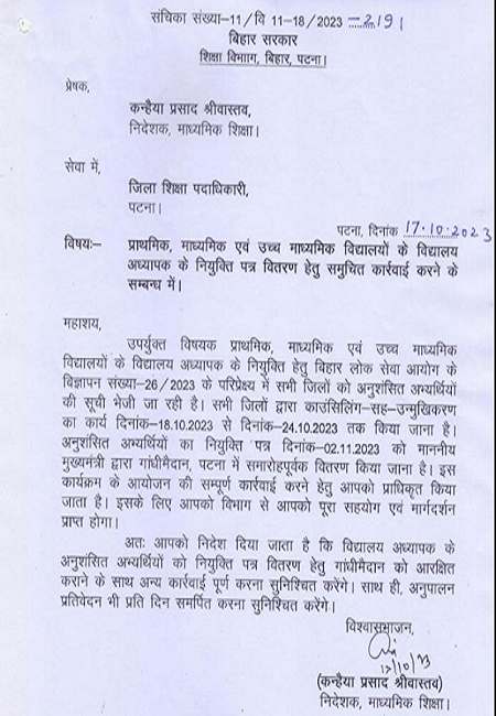 जो उम्मीदवार इस परीक्षा में सफल हुए हैं उन्हें 2 नवम्बर 2023 को पटना के गाँधी मैदान में बिहार के मुख्य मंत्री नीतीश कुमार के द्वारा नियुक्ति पत्र प्रदान किया जाएगाI