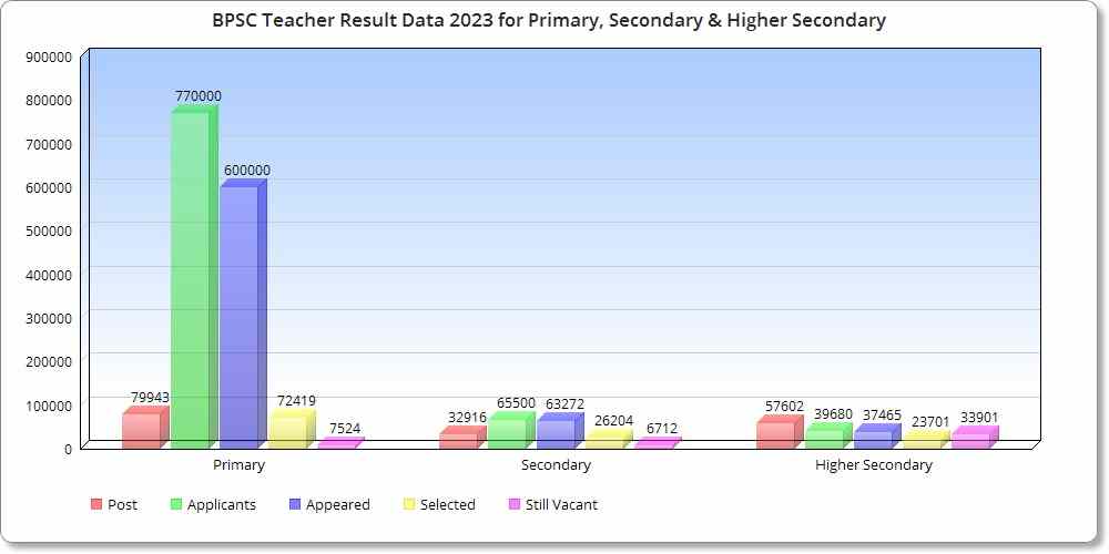 जैसे-जैसे बिहार शिक्षक भर्ती के परिणाम जारी हो रहे हैं वैसे ही नए नए डेटा भी सामने आ रहे हैंI इस बार बिहार शिक्षक भर्ती में प्राथमिक के परिणामों में हिंदी माध्यम के उम्मीदवारों का दबदबा रहा है इस बार 62653 अभ्यर्थी चयनित हुए हैंI लेटेस्ट डेटा के अनुसार, भर्ती परीक्षा उच्च माध्यमिक, माध्यमिक और प्राथमिक विद्यालयों में शिक्षकों के 1,70,461 पदों के लिए की जा रही है। इसके अलावा, BPSC शिक्षक परीक्षा रिपोर्ट के आधार पर, 1,22,234 उम्मीदवारों के लिए परिणाम घोषित किया गया है। शिक्षकों के 93% परिणाम घोषित किए जा चुके हैं जबकि शेष 7% परिणाम जल्द ही घोषित किए जाएंगे।