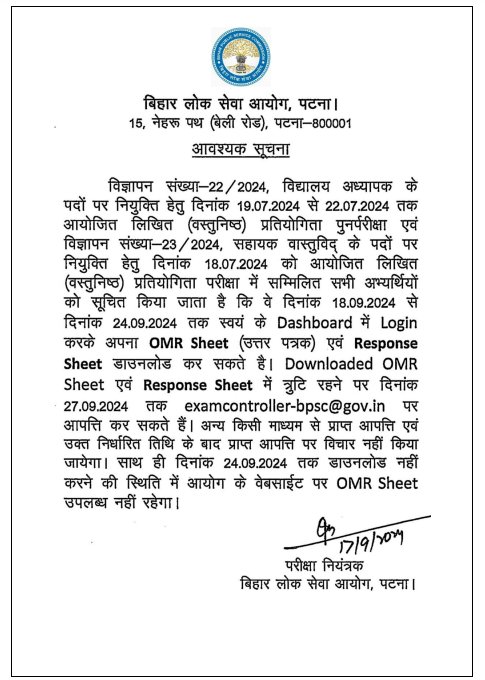 BPSC TRE 3.0 OMR Sheet 2024 OUT: बिहार लोक सेवा आयोग (BPSC) आज यानी 18 सितंबर 2024 को स्कूल शिक्षक लिखित (वस्तुनिष्ठ) प्रतियोगी पुन: परीक्षा-TRE 3.0 और Assistant Architect लिखित (वस्तुनिष्ठ) प्रतियोगी परीक्षा के लिए OMR और रिस्पॉन्स शीट जारी कर दी है। इन पदों के लिए लिखित परीक्षा में शामिल होने वाले उम्मीदवार अपने लॉगिन क्रेडेंशियल दर्ज करने के बाद अपने डैशबोर्ड से बिहार टीचर OMR रिस्पॉन्स शीट पीडीएफ डाउनलोड कर सकते हैं।