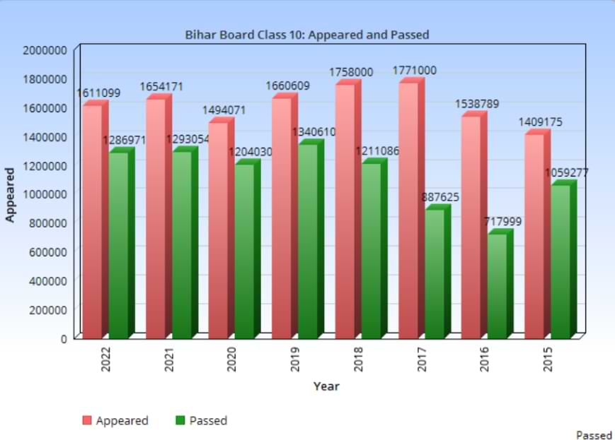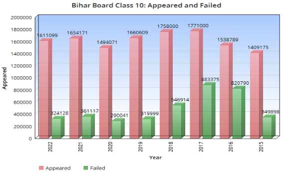पिछले आठ वर्षों के बिहार बोर्ड कक्षा दसवीं के परिणाम के आंकड़ों के आधार पर, औसतन 4.87 लाख छात्र परीक्षा में उत्तीर्ण नहीं हुए. वर्ष 2022 में, कुल 3,24,128 छात्र परीक्षा पास करने में विफल रहे. आप अन्य वर्षो में फेल हुए छात्रों का डेटा नीचे दी गई टेबल में देख सकते है.