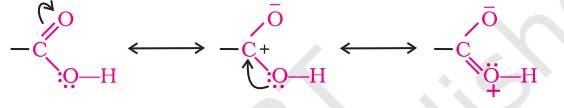 NCERT has explained that, ‘’In carboxylic acids, the bonds to the carboxyl carbon lie in one plane and are separated by about 120°. The carboxylic carbon is less electrophilic than carbonyl carbon because of the possible resonance structure as below.’’