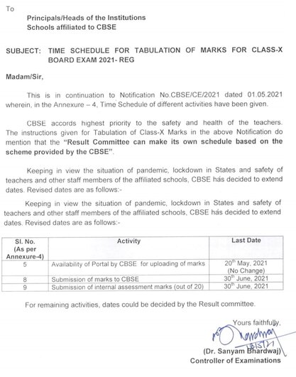 CBSE: The Central Board of Secondary Education (CBSE) has released a new schedule to submit marks of Class 10 by CBSE Schools. Now CBSE 10th Result 2021 will not be announced till 20th June as it was scheduled earlier. As per the official notification, the board decided because of the current situation of the COVID-19 pandemic, lockdown in several states and safety of teachers & other staff members of CBE School. Here is the screenshot from the official notification.