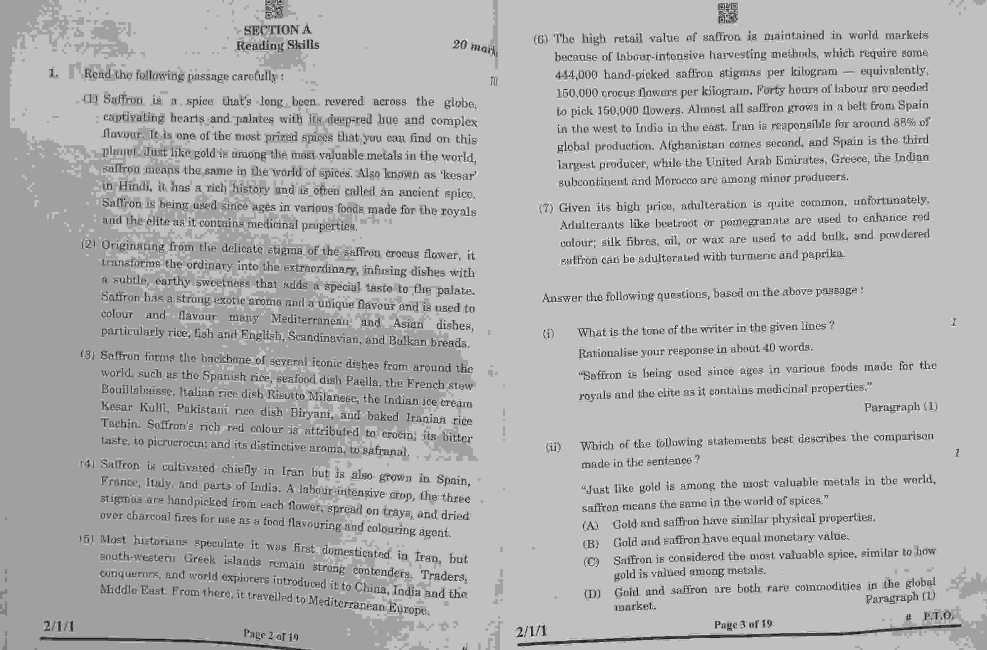 Section A: Reading Skills (20 marks) - Unseen Passages/Reading Comprehension