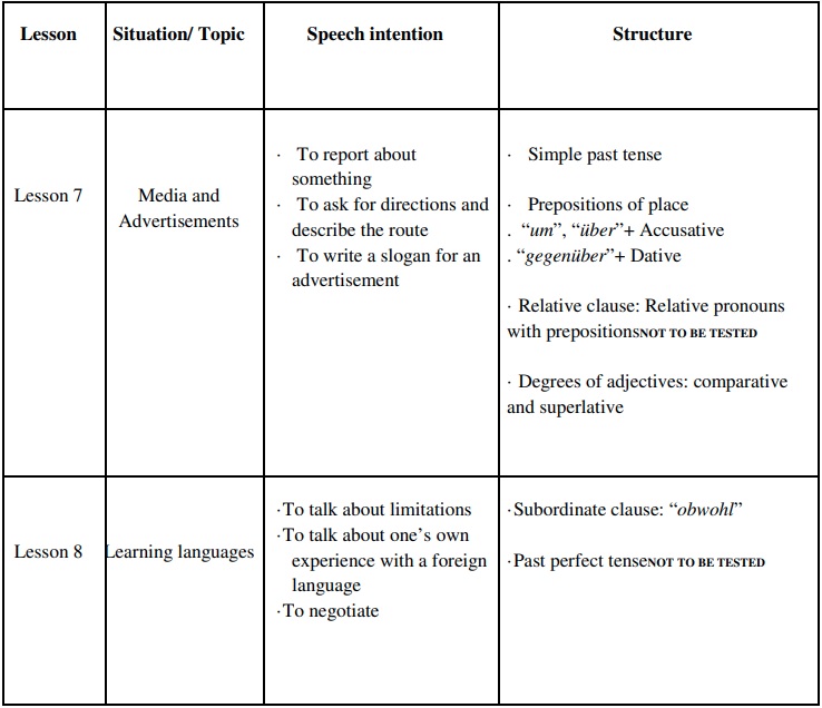 | Lesson 7 | Media and Advertisements | · To report about something · To ask for directions and describe the route · To write a slogan for an advertisement | · Simple past tense · Prepositions of place . “um”, “über”+ Accusative . “gegenüber”+ Dative · Relative clause: Relative pronouns with prepositionsNOT TO BE TESTED · Degrees of adjectives: comparative and superlative |