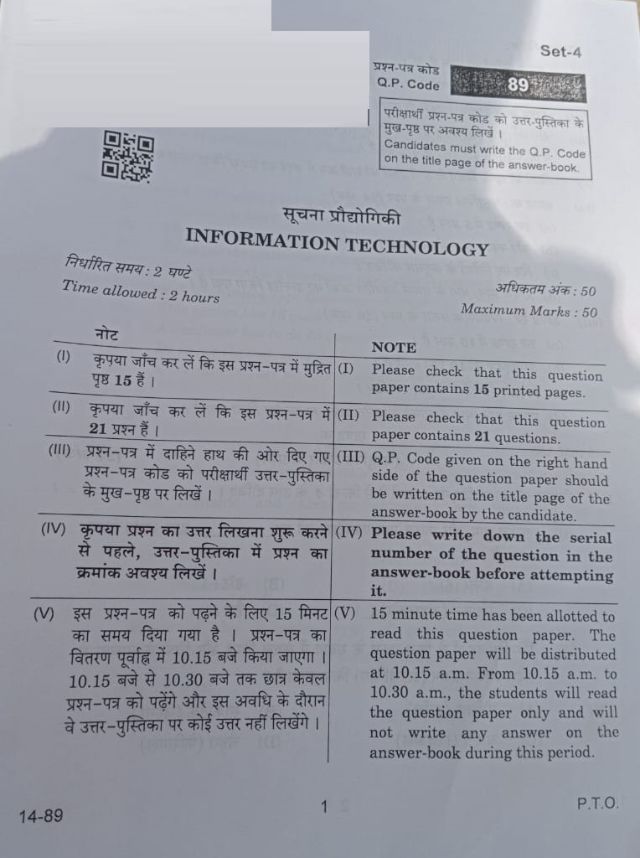 Download the CBSE Class 10 Information Technology Question Paper 2024 below: