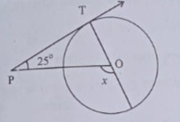 In the given figure, PT is a tangent at T to the circle with centre O. If ∠TPO=25°, then x is equal to: