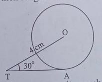 2.In the given figure, TA is a tangent to the circle with centre O such that OT = 4 cm, ∠OTA = 30°, then length of TA is: