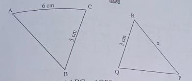 5. In the given figure, ΔABC~ΔQPR. If AC=6 cm, BC=5 cm, QR=3 cm and PR=x; then the value of x is: