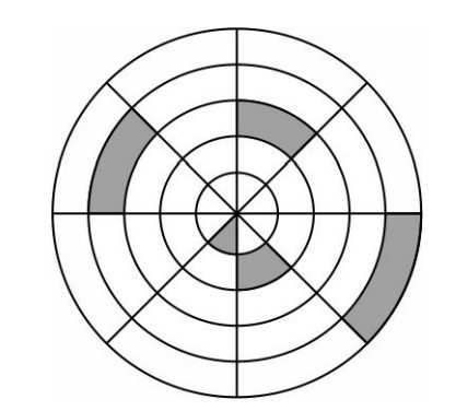 | Q:2 Shown below is a figure such that each circle is divided into equal sectors by 4 straight lines. The combined area of the shaded region is 77 square units.