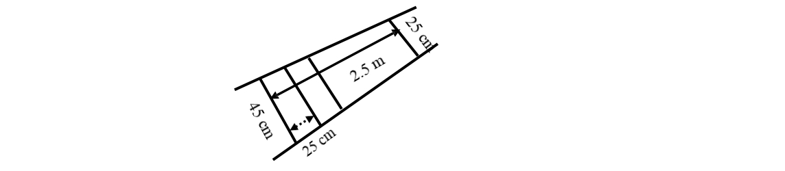 37. A carpenter wants to make a 3 m long ladder having rungs (steps) 25 cm apart. The rungsdecrease uniformly in length from 45 cm at bottom to 25 cm at the The top and bottom rungs are at a distance of 2.5 m. Answer the following questions. Assume there is no wastage of wood.