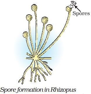 (vi) Spore formation: In this method, the parent plant produces a number of microscopic reproductive units called spores closed inside a spore case. When the spore case burst, the spores spread into air. When these air borne spores land on food or soil, they begin to germinate under favourable conditions and produce new plants. For example - Most of the fungi such as Rhizopus ( bread mould) and non-flowering plants.