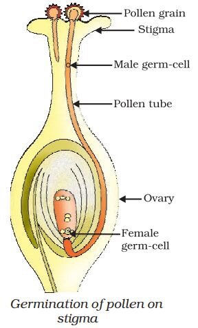 → The pollen tube enters the ovule in the ovary where the male gamete combines with the female gamete present in ovule to form a fertilized egg called zygote.