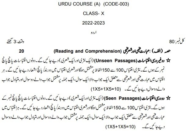 CBSE Class 10 Urdu (Course A) Syllabus 2022-2023: Download in PDF |