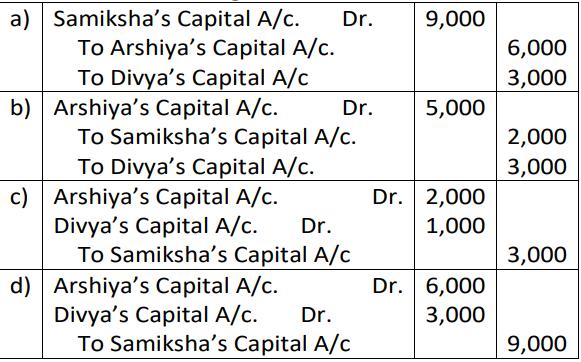 4. Samiksha, Arshiya and Divya were partners in a firm sharing profits and losses in the ratio of 5: 3: 2. With effect from 1st April 2022, they agreed to share future profits and losses in the ratio of 2: 5: 3. Their Balance Sheet showed a debit balance of ₹ 50,000 in the Profit and Loss Account and a balance of ₹ 40,000 in the Investment Fluctuation Fund. The market value of an investment is ₹30,000 against the book value of ₹50,000. Partners have decided, not to show revised valued in the balance sheet and to pass an adjusting entry for it. Which of the following is the correct treatment of the above?