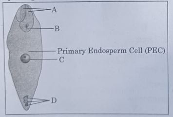 | 8.Identify the correct labellings in the figure of a fertilised embryo sac of an angiosperm given below: (A) A-zygote, B-degenerating synergids, C-degenerating antipodals, D-PEN (B) A-degenerating synergids, B-zygote, C-PEN, D-degenerating antipodals (C) A-degenerating antipodals, B-PEN, C-degenerating synergids, D-zygote (D) A-degenerating synergids, B-zygote, C-degenerating antipodals, D-PEN Answer: (B) A-degenerating synergids, B-zygote, C-PEN, D-degenerating antipodals | ||||||||||