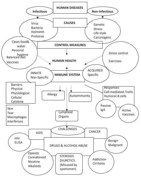 - Infectious diseases: Common cold, malaria, typhoid, pneumonia, ascariasis, filariasis, etc.