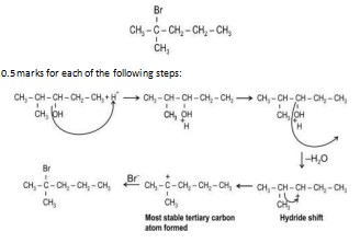 | Q.129 | (i) reduction of nitrobenzene to aniline with tin/HCl or Fe/HCl (ii) diazotisation of aniline to benzene diazonium chloride with sodium nitrite and hydrochloric acid at 0 to 5 °C (iii) hydrolysis of benzene diazonium chloride to phenol with water | 3 |