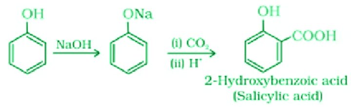 The reaction of phenol with sodium hydroxide gives sodium phenoxide which further reacts with carbon dioxide in an acidic medium to give 2-hydroxybenzoic acid (Salicylic acid).