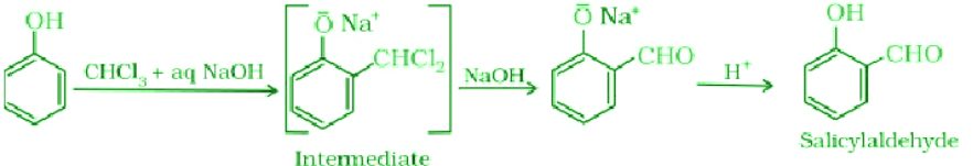 Reaction of phenol with chloroform in the presence of sodium hydroxide to introduce -CHO group at the ortho position of the benzene ring. It results in the formation of salicylaldehyde.