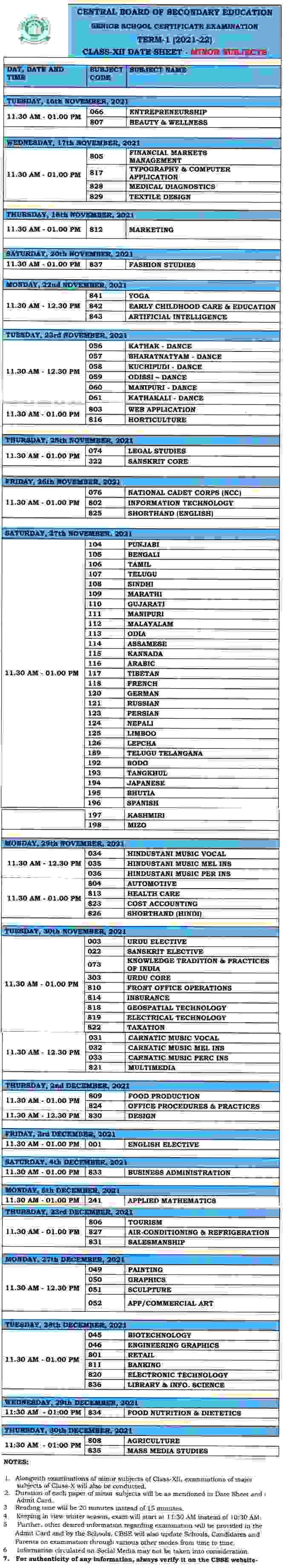 CBSE Class 12 Date Sheet (Term 1) 2022: CBSE 12th Time Table 2022 (Term 1)Download CBSE Term 1 Class 12 Date Sheet 2021-2022 (PDF): CBSE Class 12 Board Exam Time Table (PDF) for Science, Commerce, Arts