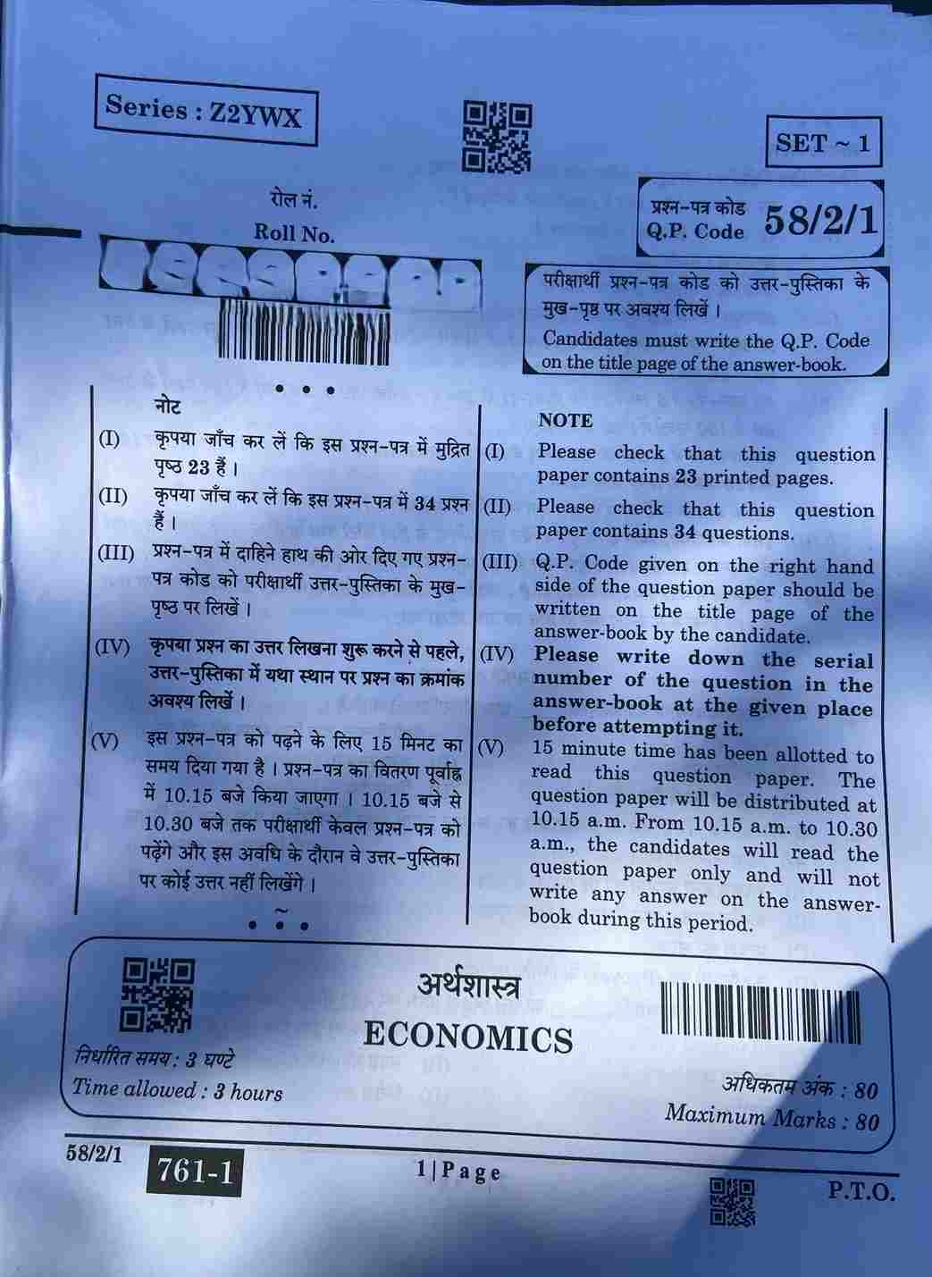 CBSE Class 12 Economics Question Paper 2025 SET-1(58/2/1)