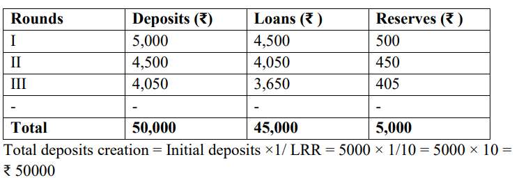 Ans: Working of credit creation process : Total credit = initial deposits ×1/ LRR Initially, customer deposits ₹ 5,000 and LRR is 10 % . Bank keeps ₹ 500 reserves to meet customers’ obligations and give loans of ₹ 4500. Those who borrow will spend this money and same ₹ 4500 will ultimately come back to bank as fresh deposits .And this process goes continuously until initial deposits becomes equals to total reserves. Credit creation process is give below:
