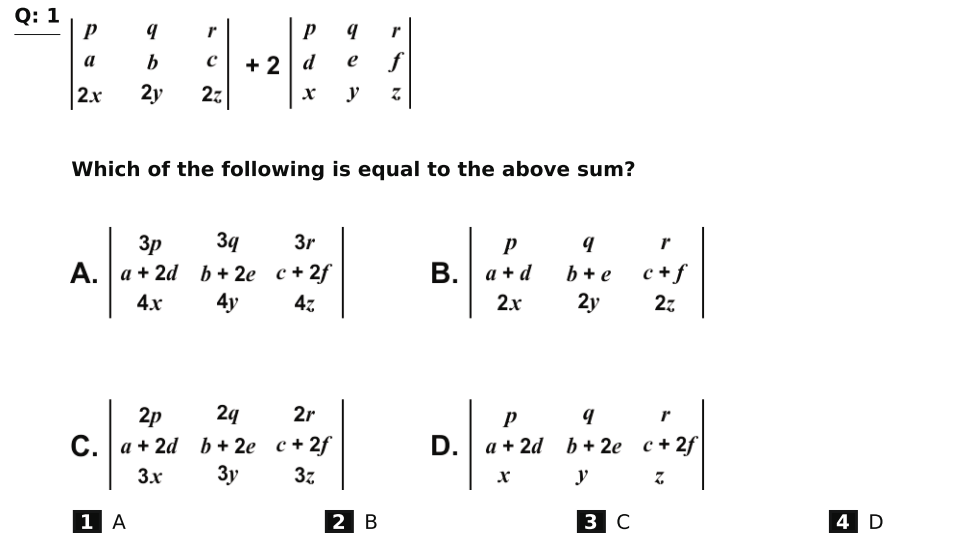 The chapter 4 CBQs for Class 12 Maths are given below. The questions provided here are MCQs whose complete PDF is attached at the end of these questions along with Volume 2 with free response questions.