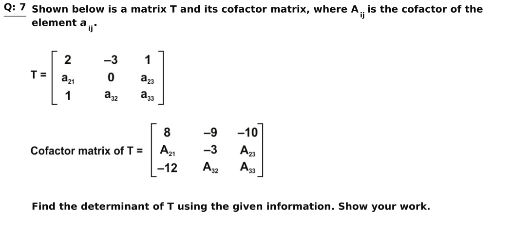 Q6. Evaluate the determinant, IAI, of the matrix shown below. Justify your answer.