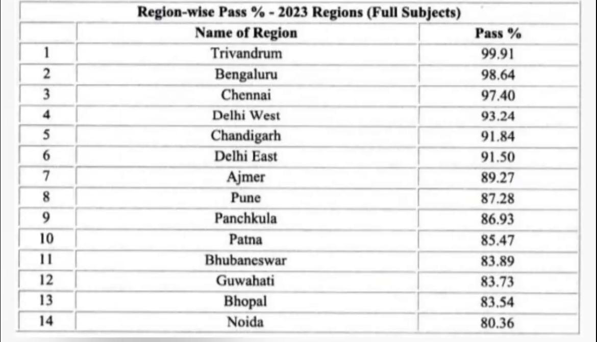 चेन्नई, दिल्ली पश्चिम और चंडीगढ़ टॉप-5 रीजन में शामिल हैं. नोएडा रीजन में सबसे कम पास प्रतिशत (80.36) है.