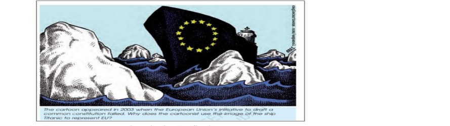 Ans. This cartoon shows the failure of the EU which is the common constitution of the EU. Here titanic represents the European Union constitution and these stones represent the difficulties.