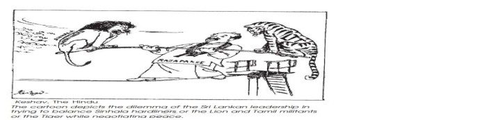 (iii) The cartoon depicts the dilemma of the Sri Lankan leadership in trying to balance Sinhala hardliners or the Lion and Tamils militants or the Tiger while negotiating peace. The Government thinks if it goes according to the Sinhala community, actions would be taken by LTTE in Sri Lanka, and if LTTE is given preference, the Sinhala community will become upset and the country would be divided.