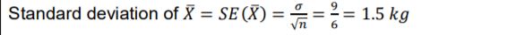 4. Sampling distribution of the sample means 𝑋 is formed from a population with mean weight 𝜇 = 60𝑘𝑔 and standard deviation 𝜎 = 9𝑘𝑔. What is the expected value and standard deviation of 𝑋, if the sample size is 36?