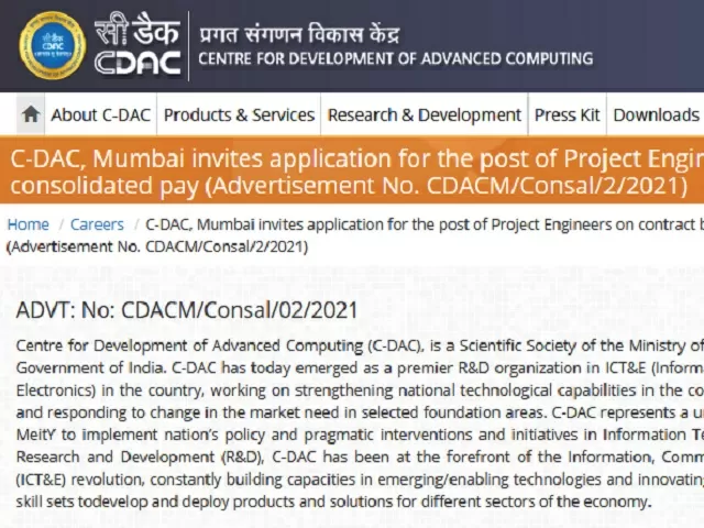 CDAC भर्ती 2021: सेंटर फॉर डेवलपमेंट ऑफ़ एडवांस कंप्यूटिंग (C-DAC), मुंबई ने प्रोजेक्ट इंजीनियर के पद पर भर्ती के लिए एक अधिसूचना प्रकाशित किया है. इच्छुक उम्मीदवार CDAC भर्ती 2021 के लिए आधिकारिक वेबसाइट (cdac.in) पर 22 जून से 03 जुलाई 2021 तक आवेदन कर सकते हैं.