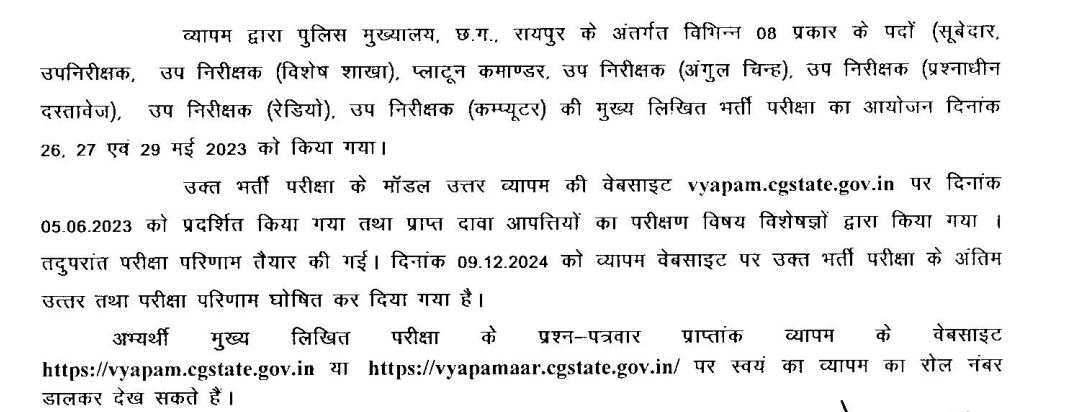 CG Vyapam Subedar, SI and other posts Result OUT: पुलिस मुख्यालय, छत्तीसगढ़, नवा रायपुर के अंतर्गत विभिन्न पदों (सूबेदार, उपनिरीक्षक, उप निरीक्षक(विशेष शाखा ), प्लाटून कमाण्डर, उप निरीक्षक(अंगुल चिन्ह), उपनिरीक्षक(प्रश्नाधीन दस्तावेज), उपनिरीक्षक(कम्प्यूटर), उपनिरीक्षक(रेडियो) की प्रारंभिक लिखित भर्ती परीक्षा - 2022 के परीक्षा परिणाम जारी कर दिए गए हैं। इन पदों के लिए परीक्षा 26, 27 और 29 मई 2023 को राज्य के विभिन्न केंद्रों पर आयोजित की गई थी। इस परीक्षा में शामिल होने वाले उम्मीदवार आधिकारिक वेबसाइट vyapam.cgstate.gov.in पर जाकर रिजल्ट चेक और डाउनलोड कर सकते हैं। रिजल्ट देखने का सीधा लिंक इस लेख में दिया गया है। साथ ही बोर्ड ने फाइनल आंसर की भी जारी कर दी है।