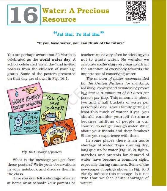 Chapter 16 - Water: A Precious Resource of Class 7 Science NCERT Book (PDF) is available here for download in PDF format. Chapter 16 of Class 7 Science NCERT Books is one of the important chapters and also one of the interesting chapters. Students are advised to learn this chapter and prepare for Class 7 Science exams.