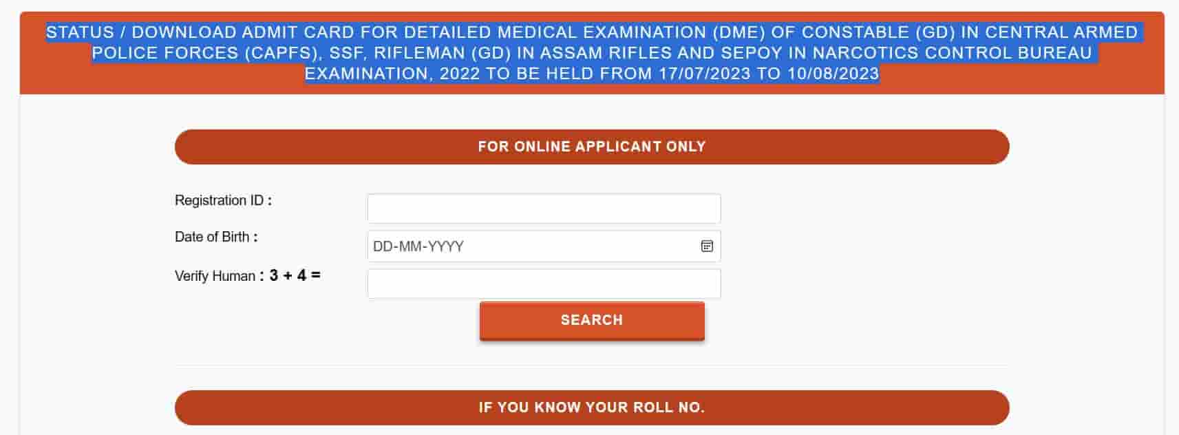 - Click on ‘Download E-Admit card for DV/DME & RME events of CT(GD) Exam-2022 in CAPFs, SSF and Rifleman (GD) in Assam Rifles for qualified/ shortlisted candidates is scheduled from 17/07/2023 onwards’
